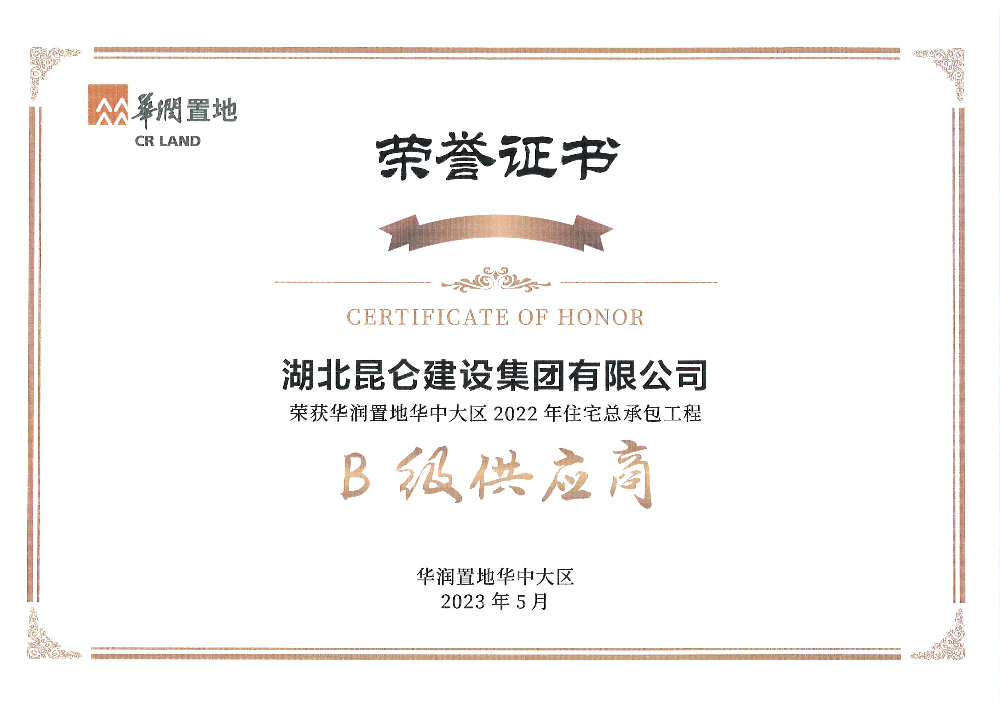2023年5月榮獲華潤置地供應商“攻艱克難獎”